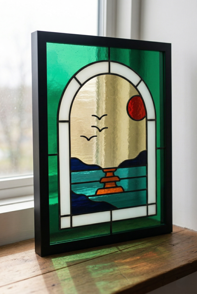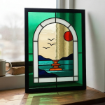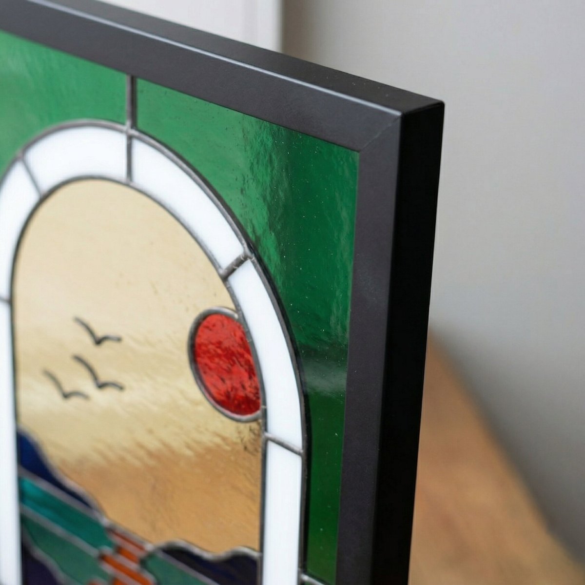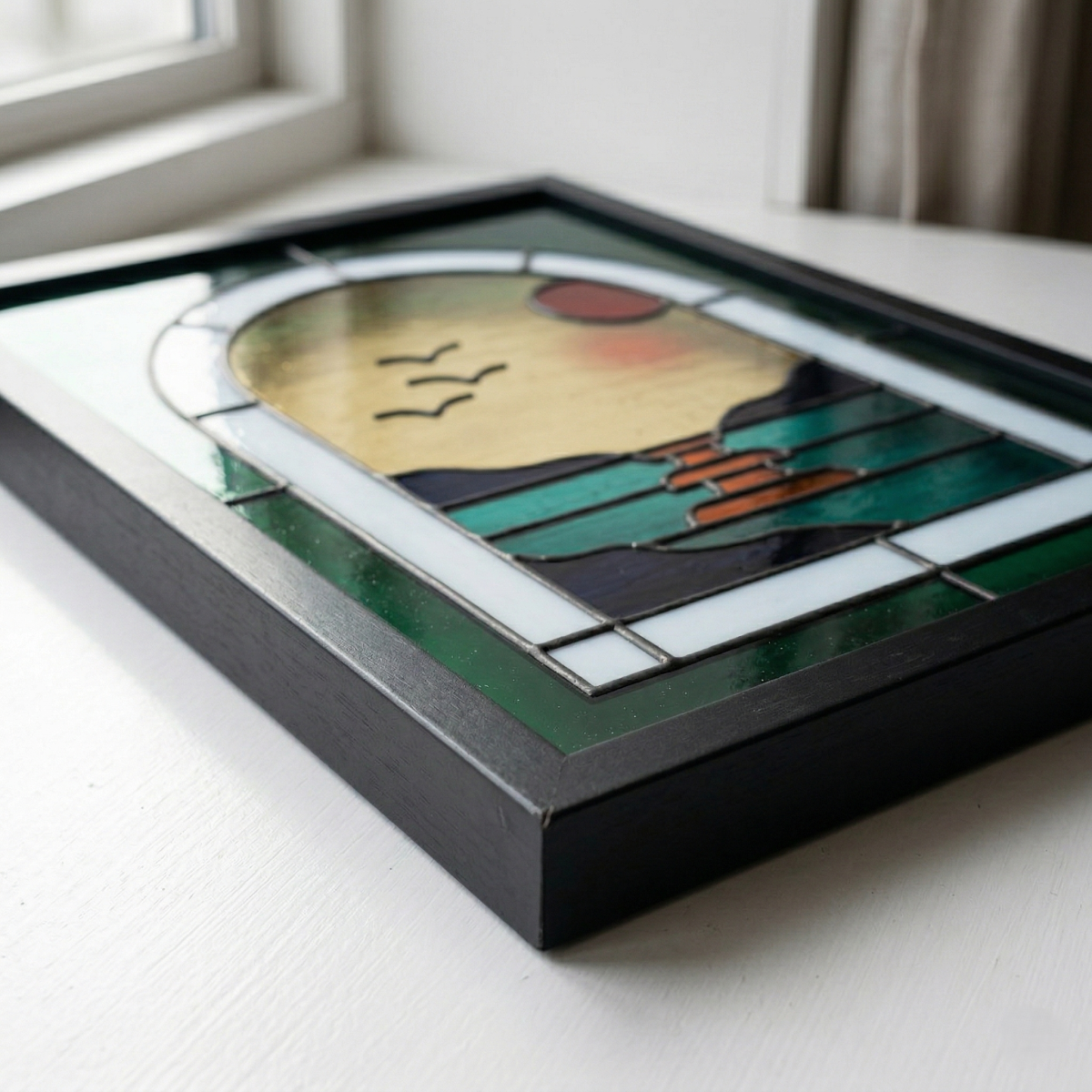 Apportez une sérénité contemplative à votre intérieur avec le vitrail "Arc Émeraude - Horizon". Cette œuvre épurée fusionne le savoir-faire traditionnel du vitrail avec une esthétique minimaliste et moderne.