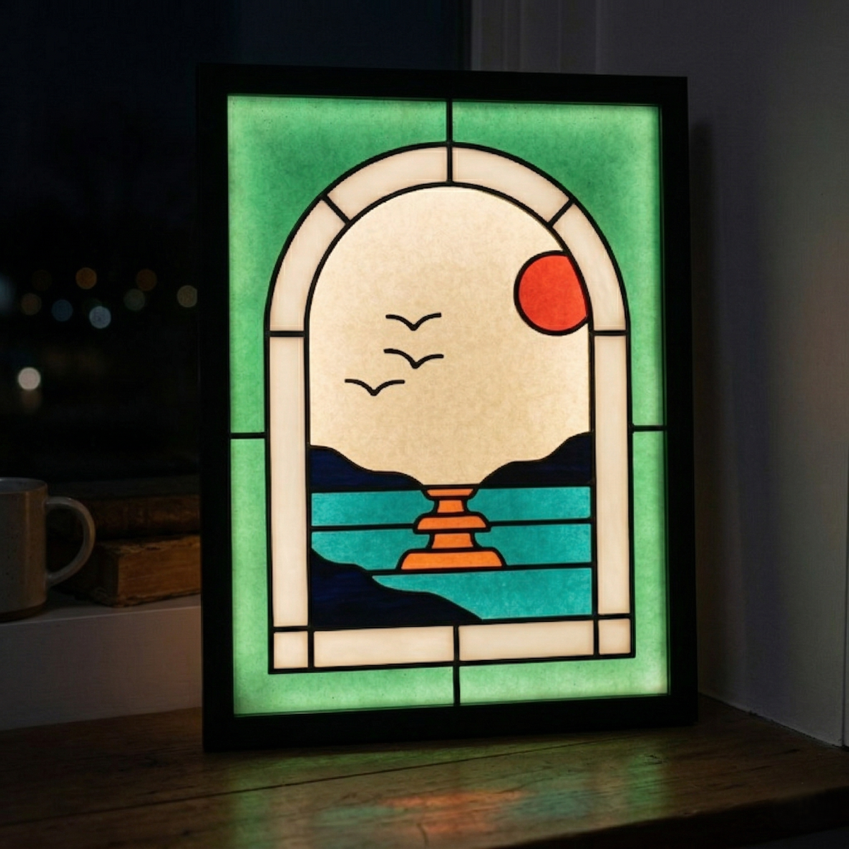 Le jour c'est un vitrail qui prend la lumière du soleil près d'une fenêtre et avec l'option LED, la nuit c'est une lampe d'ambiance chaleureuse et originale.