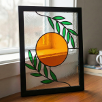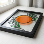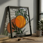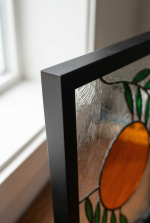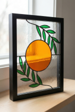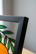 Apportez une touche de fraîcheur méditerranéenne à votre intérieur avec le vitrail "Eclat de Sicile". Cette création minimaliste met en scène une orange vibrante et ses feuilles d'un vert profond, et des textures rappelant les mouvements de l'eau capturant l'essence du soleil dans une composition épurée.