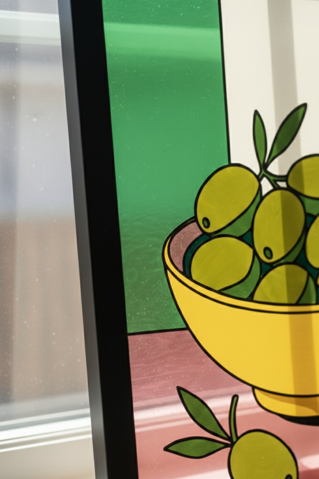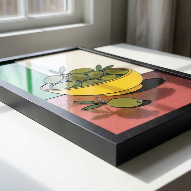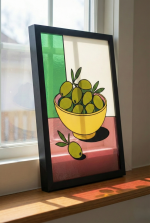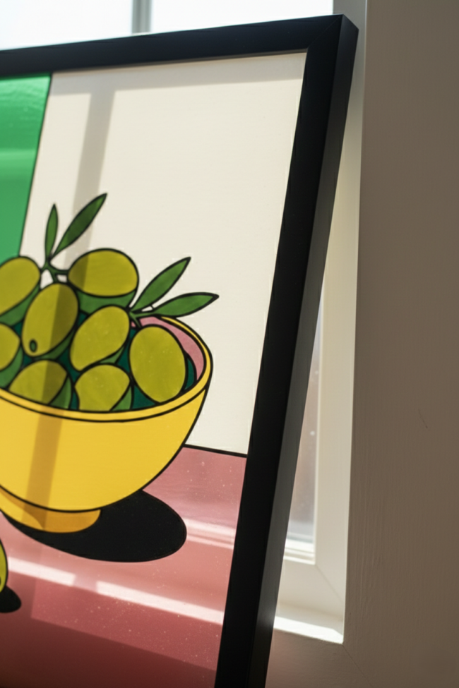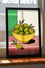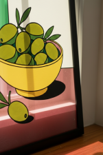 Réalisée par un jeune artiste émergent, cette pièce mise sur la pureté des lignes et le contraste des couleurs. Le jaune solaire du bol et les nuances vibrantes des olives s'assemblent dans une composition épurée qui capture l'essence même de la convivialité et de la lumière du Sud.