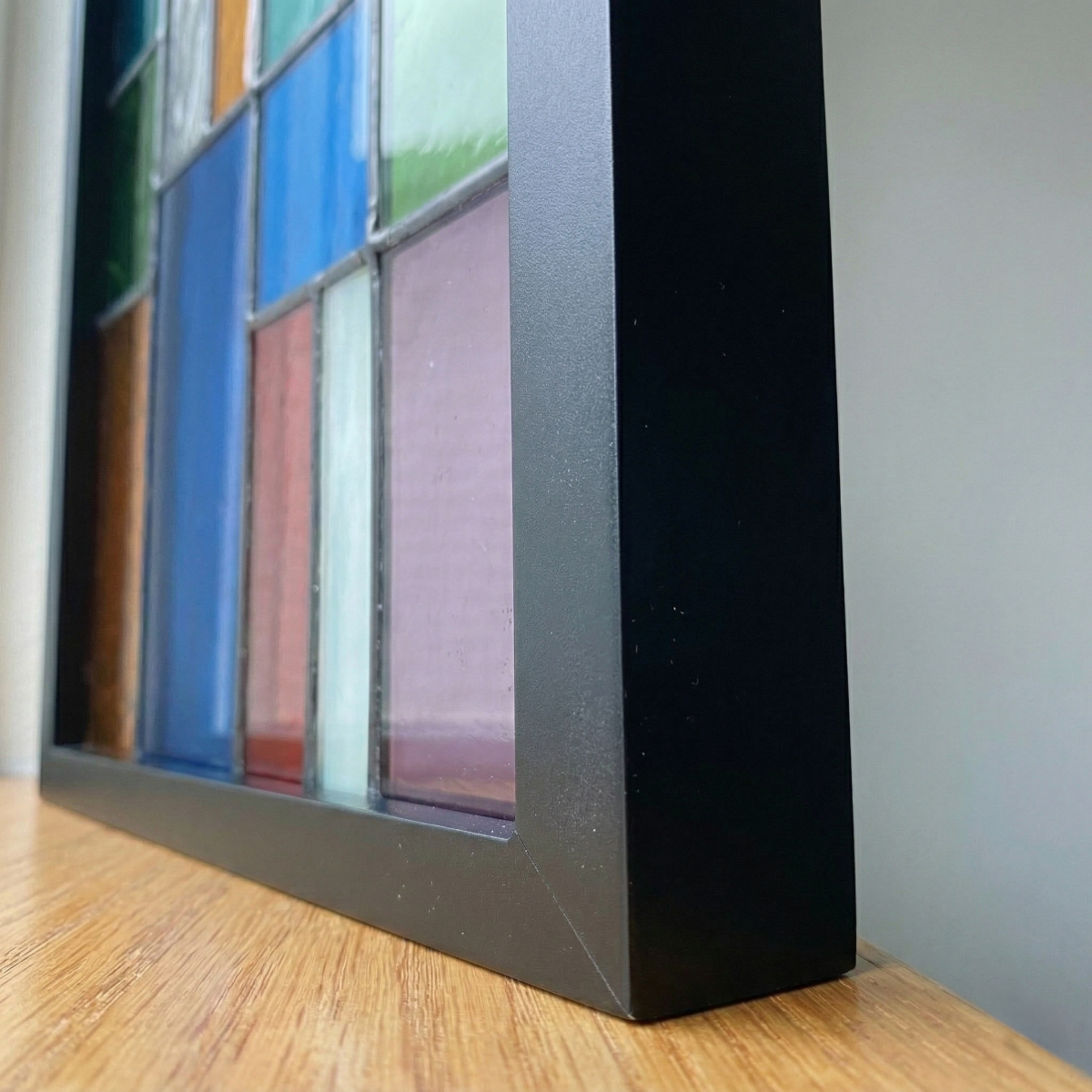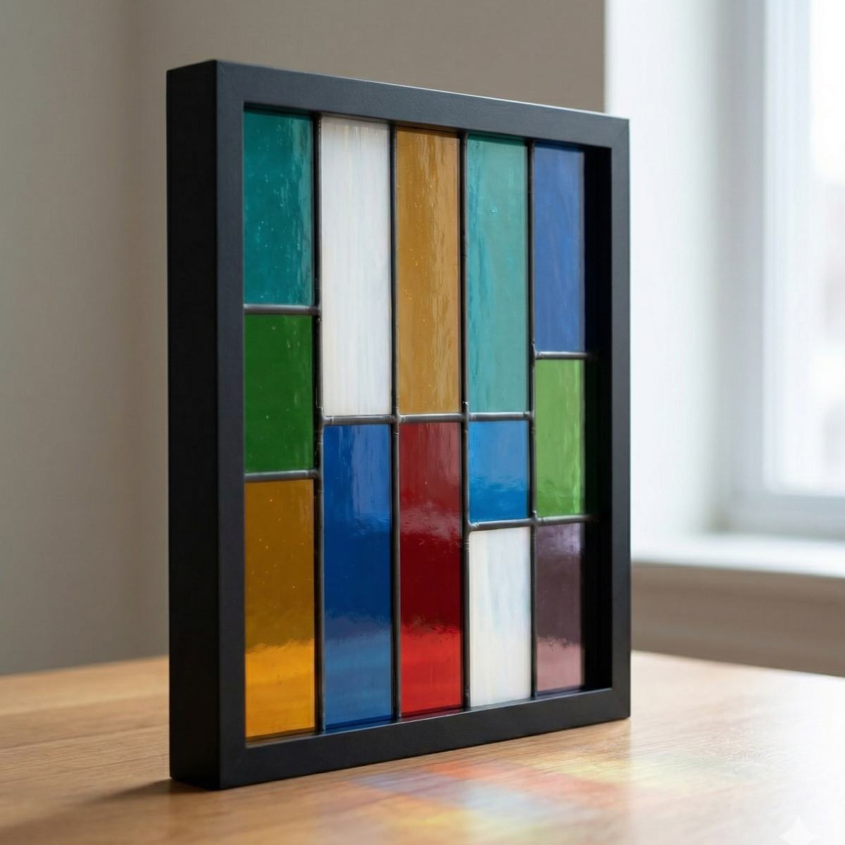 Apportez une touche d'équilibre et de modernité à votre intérieur avec le vitrail "Mosaïque Primaire". Cette œuvre s'approprie les codes du minimalisme en assemblant des formes géométriques pures pour un résultat à la fois sobre et vibrant.