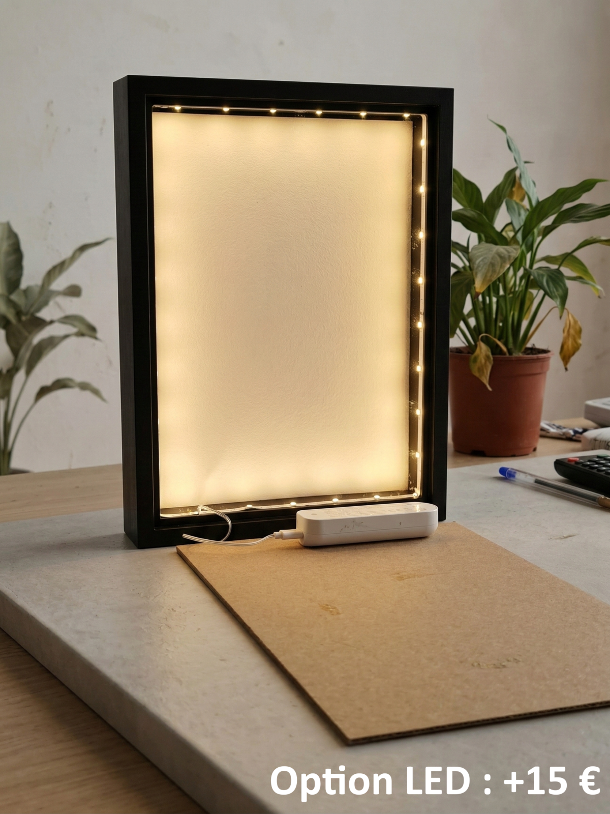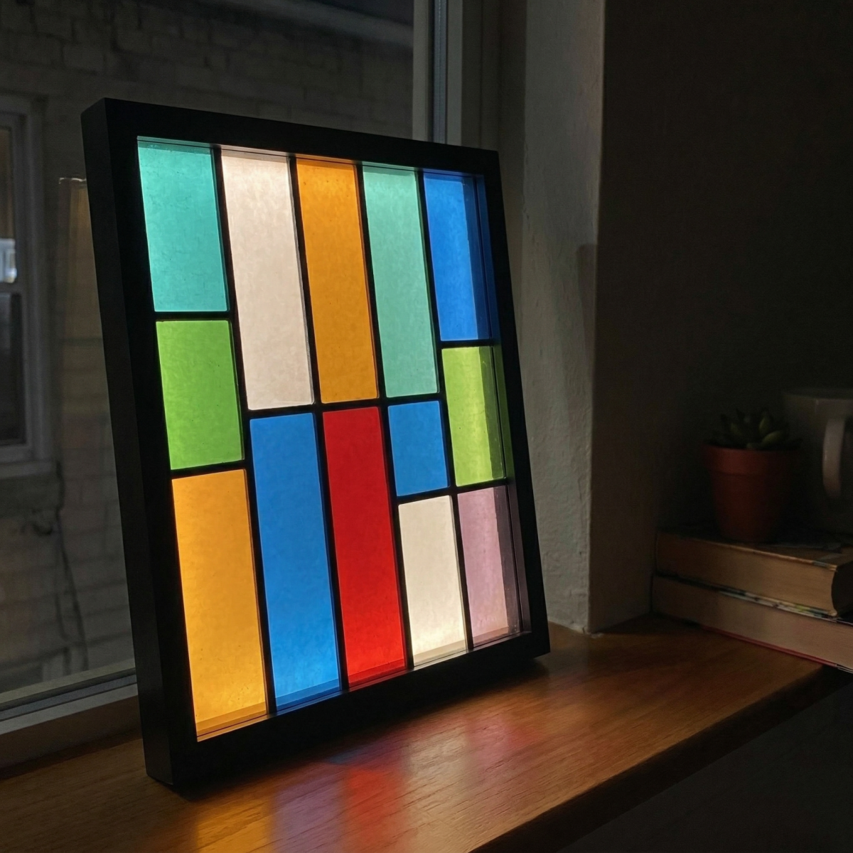 Le jour c'est un vitrail qui prend la lumière du soleil près d'une fenêtre et avec l'option LED, la nuit c'est une lampe d'ambiance chaleureuse et originale.