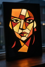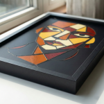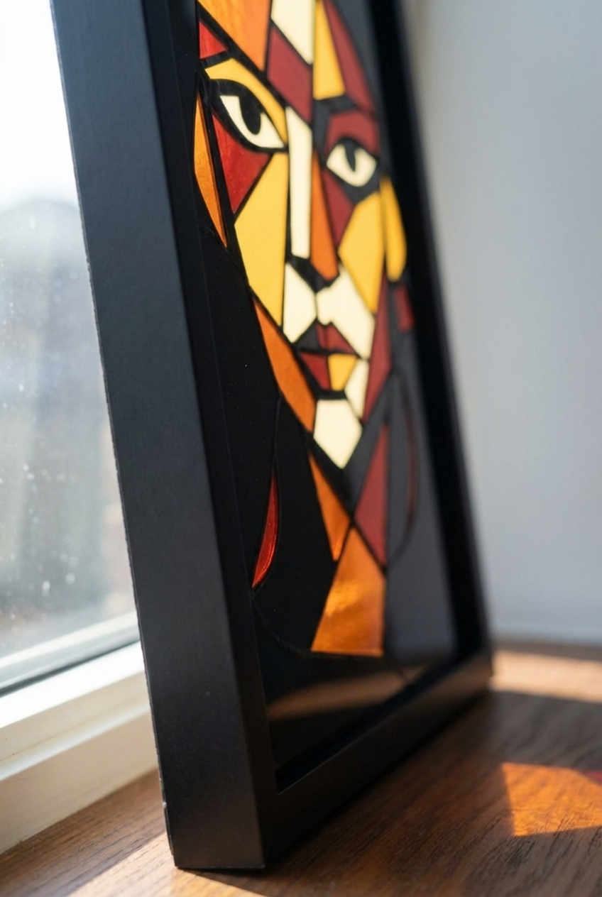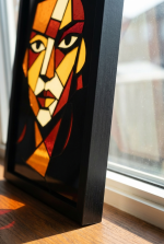 Apportez une touche de modernité vibrante à votre intérieur avec le portrait "Masque Solaire". Cette œuvre unique fusionne le savoir-faire traditionnel du vitrail avec une esthétique graphique et audacieuse.